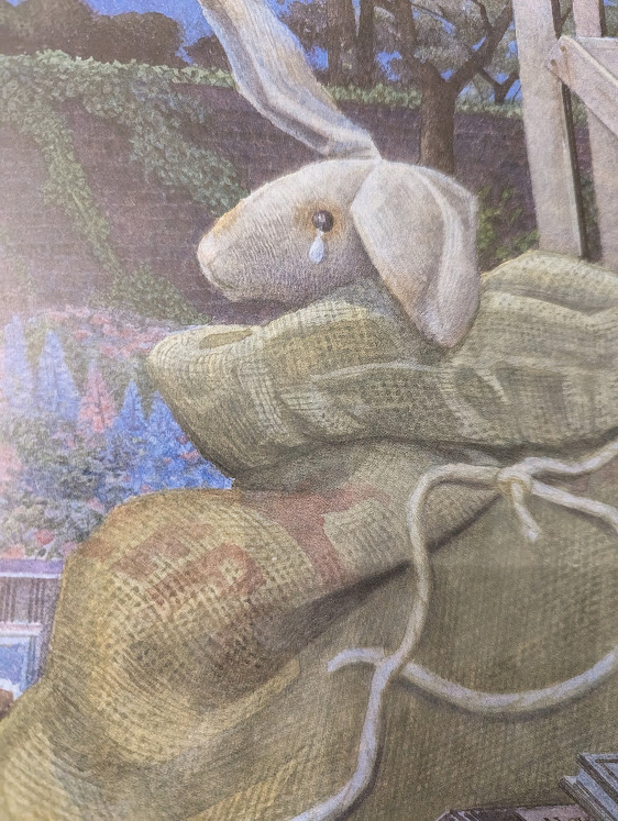 Here’s the velveteen rabbit so sad it cries a single real tear and DEAR GOD WHY DID I GO LOOKING FOR A USABLE PHOTO FROM THIS BOOK?!